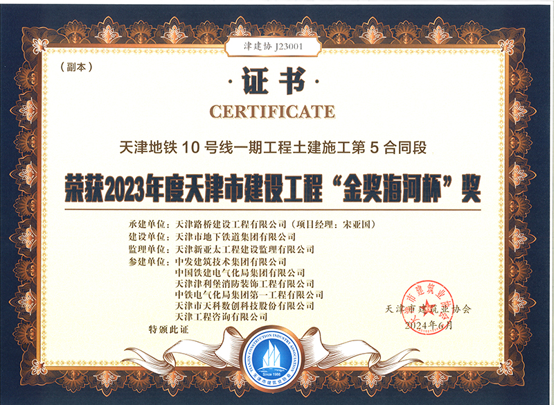 天津地鐵10號線一期工程土建施工第5合同段榮獲2023年度天津市建設工程“金獎海河杯”獎